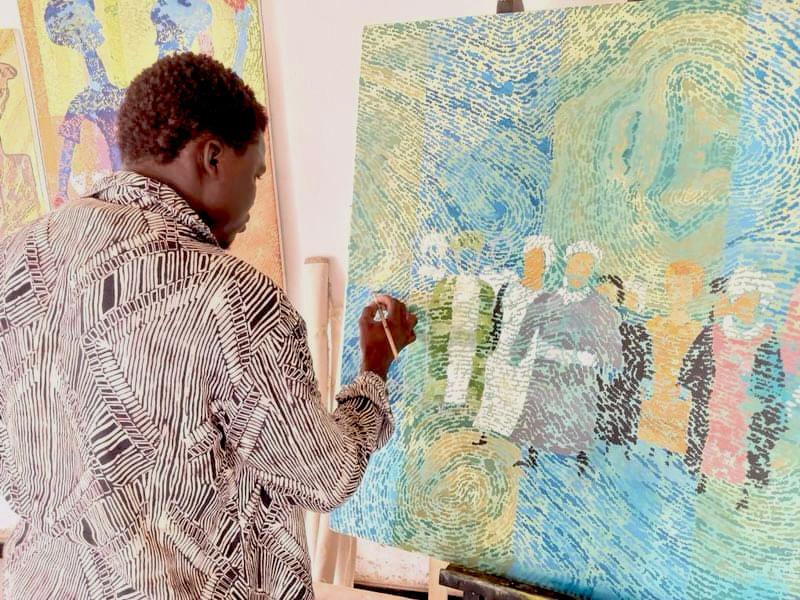 Once the sketches are complete, Djibril moves on to the painting phase. He employs various techniques to apply colors, seeking to capture not only visual beauty but also the emotion and spiritual depth of his subjects. The nuances of colors play a crucial role in creating specific atmospheres and feelings, enriching the visual narrative of his paintings.