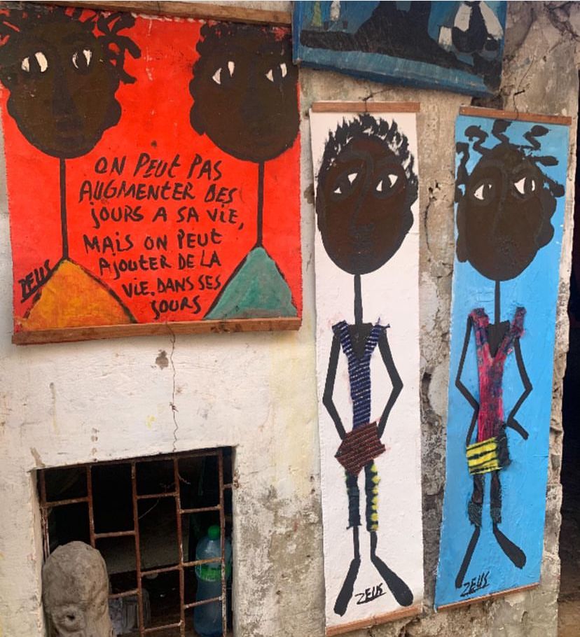 I collect a bit of everything: paint can lids, bicycle wheels, scraps of Wax fabric. I paint all of these with acrylics. I use many materials I find in the streets, giving them a second life.