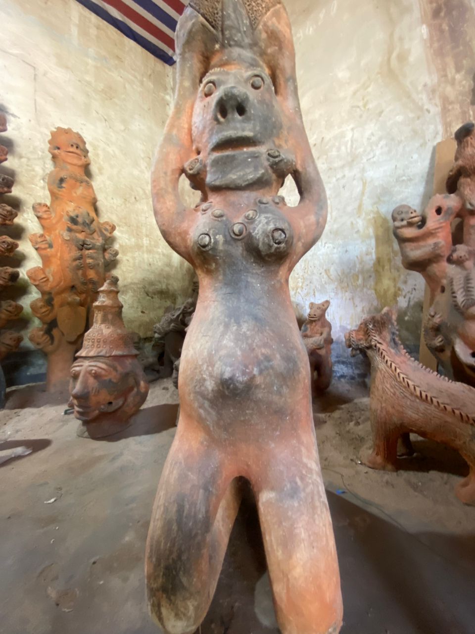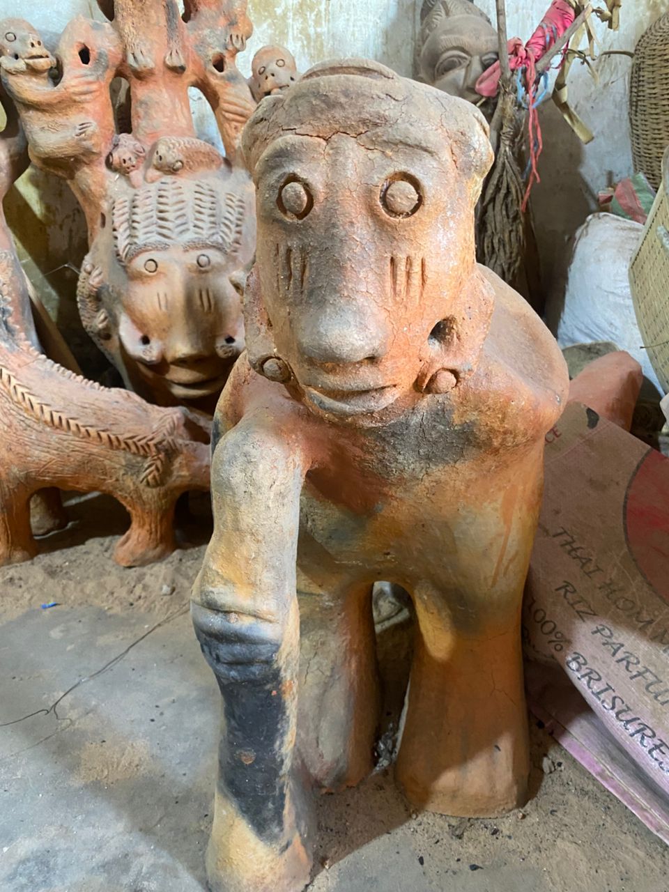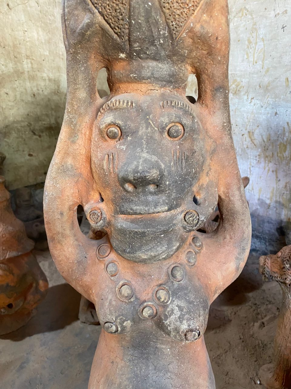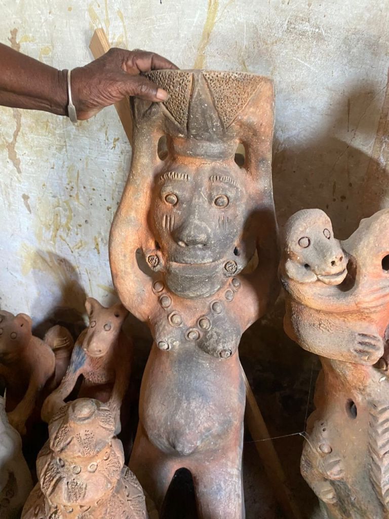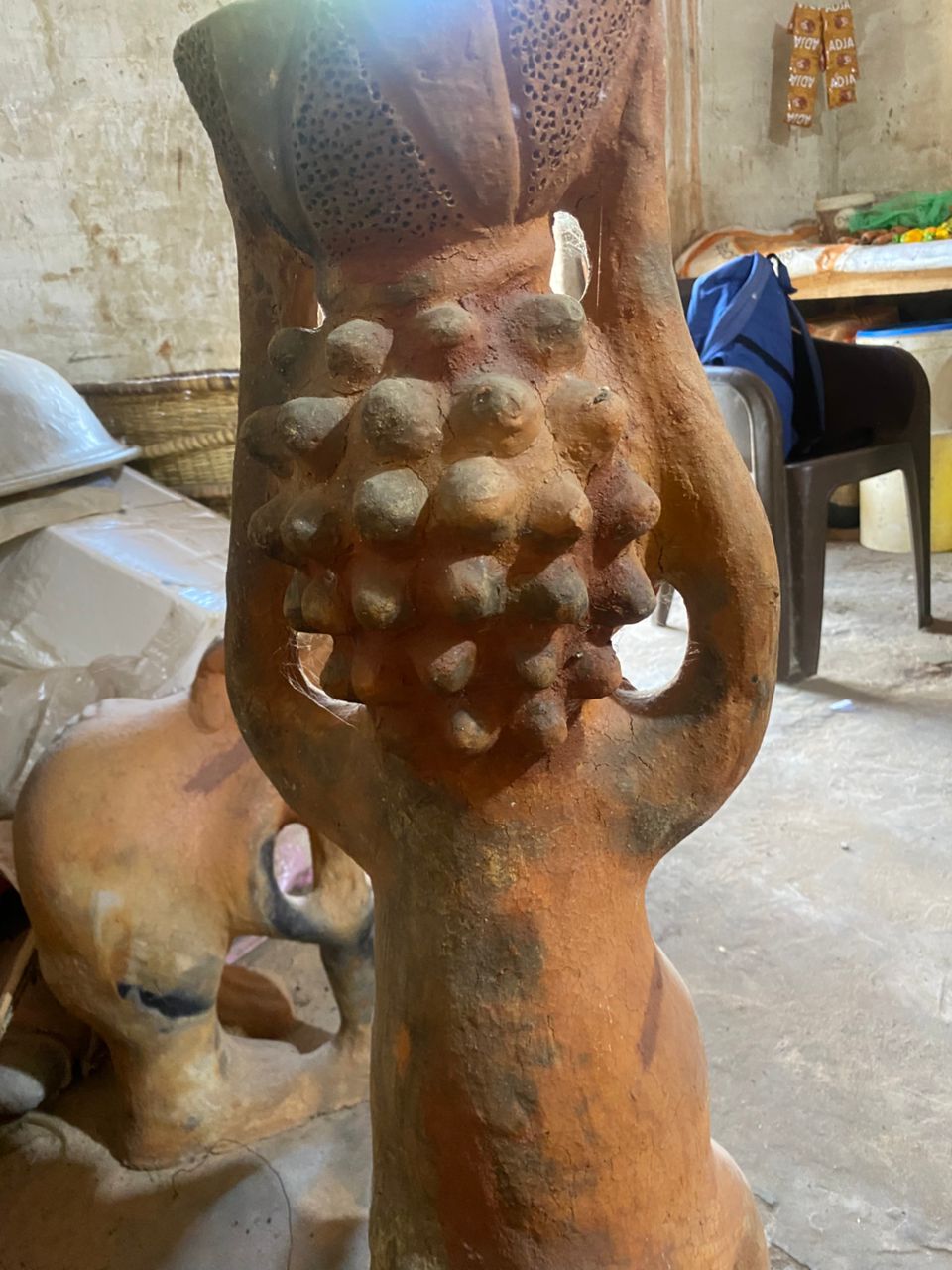 Seyni warmly welcomes us, surrounded by her stunning creations. When asked which of her works she prefers, she pauses, reflects, and then points with a smile to a terracotta sculpture about 80 cm tall: a kneeling pregnant woman carrying a water jar on her head.
