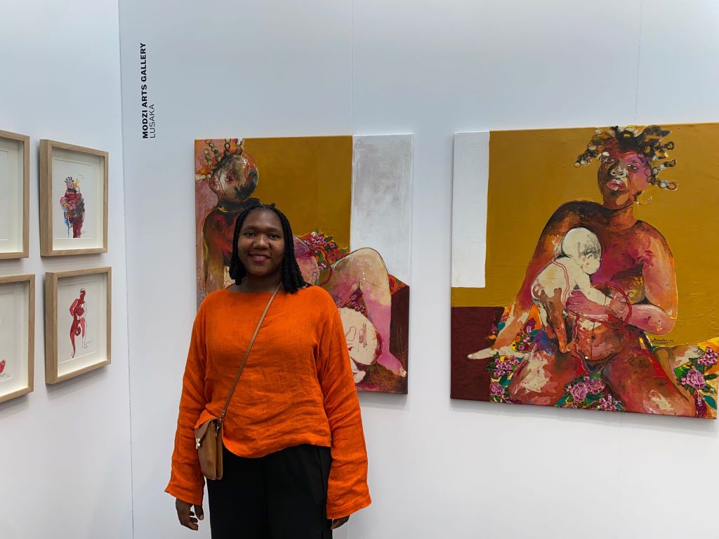 Represented by Modzi Arts, zambian artist Mwamba Chikwemba presents deeply personal reflections on motherhood and postpartum experience. “I’m a new mom,” she shares. “My work opens up conversations about postpartum depression and the emotional shifts women experience.” Her canvases create space for dialogue around themes often overlooked in global discourse.