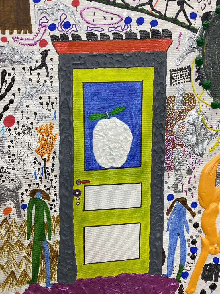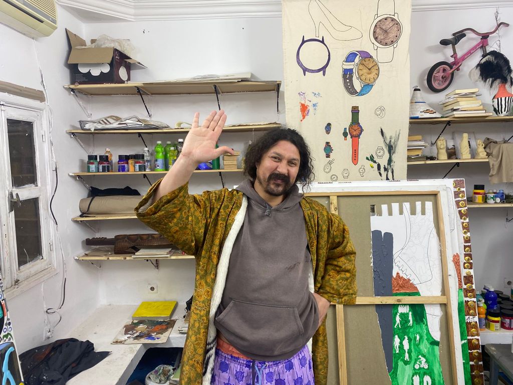 They’re beautiful because they’re like my kids. You can’t say your child isn’t beautiful. Even if others see something far from a Roman sculpture, for me it’s my kid. I don’t believe in logic when it comes to my work. And my work is not only about what I like. I use colors I dislike. They don’t give me a good mental state. They don’t make me feel good. But my work is not me dressing and going to the street. In the street, I would wear what makes me feel good. But that’s not my work. My work is about political agitation. It’s about having a complex conversation with panic—being panicked in life. When you are a kid and you have no mama, no papa, and you’re thrown in the street, and you feel nobody is looking at you—not the state, not the people—and you’re treated like an insect. That’s why a lot of the colors I use come from insects. The palettes I’m inspired by come from insects. The idea of “you are an insect.” That state of being alone—not solitude, loneliness. Being trapped and having no solution. Jalal al-Din Rumi says something beautiful: the one who doesn’t want you will find a hole in the door to go out; the one who wants you will find a hole in the rock to come towards you. Even in complex situations, I believe in human beings finding a hole in the rock—some optimism—to be in a space where you can be a little comfortable with your existence instead of becoming a horrible person. Because pain and tragedy can make you a horrible person. And as a human being, I don’t accept that. I work so much on being a gentleman.