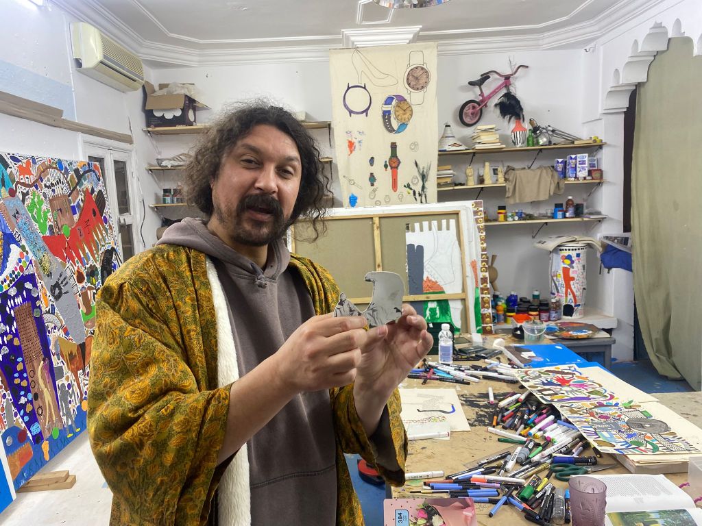 In the village of Touggana, a quiet settlement on the outskirts of Marrakech where the city’s frenetic energy gives way to open sky and sparse olive groves, Mohamed Baala — known as Mo Baala — welcomed DakArtNews into his studio, a space that feels worlds apart from the tourist circuits and gallery districts. Baala, 39, does not speak of art as vocation or intellectual exercise but as an urgent, lifelong necessity. Born in Casablanca in 1986 and raised in Taroudant, he is entirely self-taught, having developed a multidisciplinary practice — encompassing painting, collage, installation, performance, sculpture, poetry and music — through years of street survival, market labor as a vendor in the souks, and solitary, voracious reading.