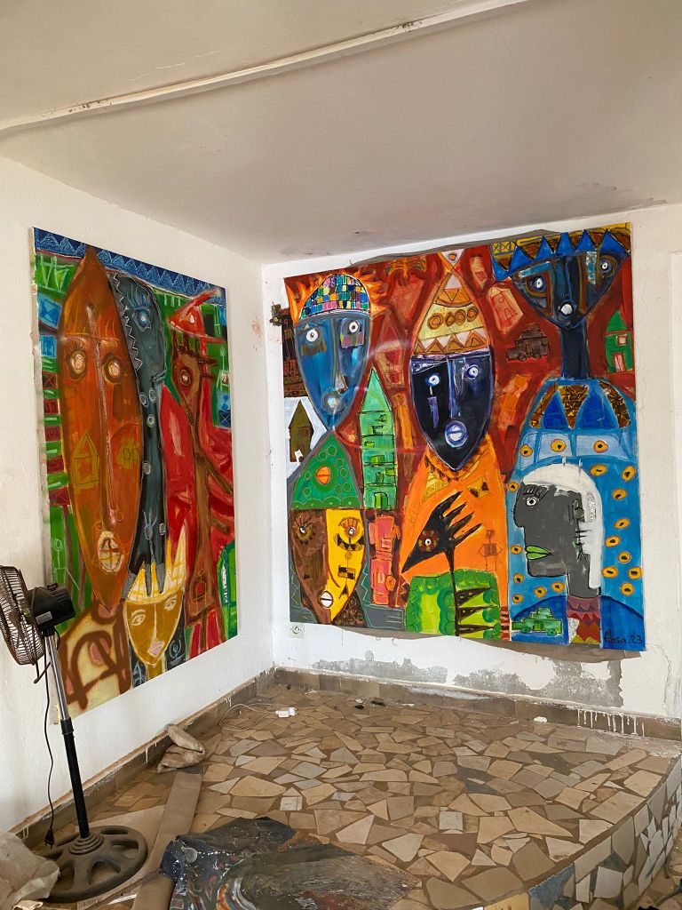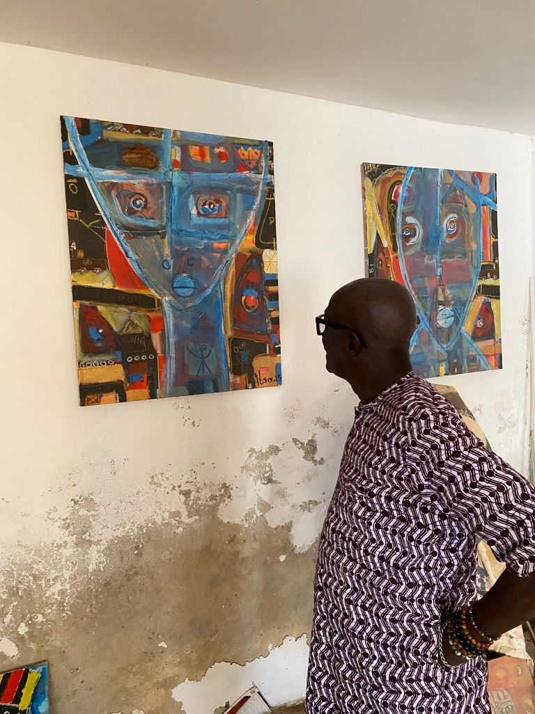He has never separated his cinematographic practice from his work as a painter. For him, painting and cinema engage in an organic dialogue, two expressions of the same artistic quest. It is in this studio facing the ocean, with the sound of the waves in the background and the shifting light of the coast, that we met him for this studio visit. Surrounded by works in progress, brushes, and notebooks, Moussa Sène Absa spoke with rare sincerity and depth.